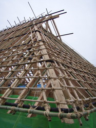 今回は垂木が竹となり釘打ち出来ないので、カヤオイも丸竹を藁縄で結わえ付けて使います。